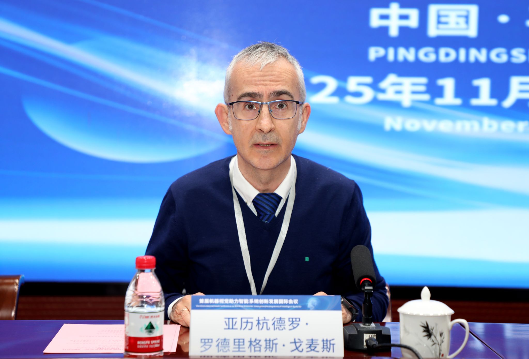 亚历杭德罗・罗德里格斯・戈麦斯教授代表西班牙马拉加大学对会议顺利召开表示祝贺。他指出,两校虽远隔重洋,但对科学真理的追求与技术创新的热忱早已紧密相连;依托共建的国际联合实验室,双方科研团队持续开展学术交流与协同攻关,共同致力于推动机器视觉与智能系统领域的融合发展。他高度赞赏我校开放办学与产教融合的务实精神,肯定马拉加工程学院作为中外教育资源共享典范、尧山实验室服务地方产业的重要价值,并表示马拉加大学愿进一步拓展合作广度与深度,在重大课题攻关、师生互访等方面深化协作,让思想的火花跨越山海,让创新的种子在两地茁壮成长、共结硕果。