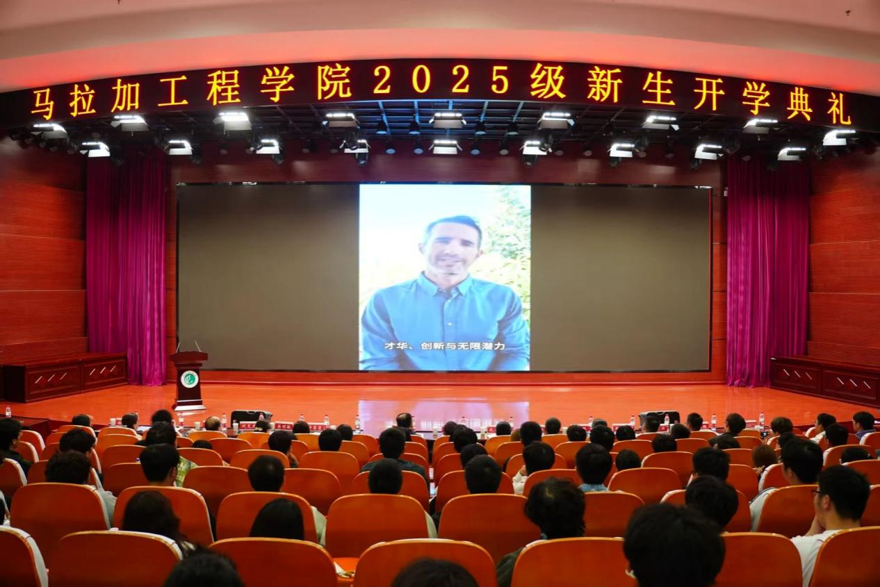 于长立副校长在致辞中对2025级新生的到来表示热烈欢迎和祝贺。他介绍了马拉加工程学院独特的办学优势,并充分肯定了新生在前置课程学习和军训期间展现出的良好精神风貌。他寄语新生四点期望:一是以德润心,厚植家国情怀,将个人理想融入民族复兴事业;二是以学强基,拓宽全球视野,善用学院“双轨平台”提升跨文化交流能力;三是以行促知,锤炼实践本领,在实验室、科研项目中练就真功夫;四是以志立身,勇攀人生高峰,在不断突破中实现从“合格”到“卓越”的跃升。