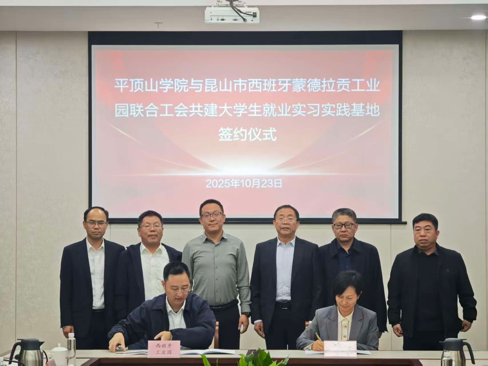 马拉加工程学院党委书记孙学荣分别与昆山市西班牙工业园工会联合会主席张奇、昆山日月同芯半导体有限公司人资负责人邹丹娇、艺唯科技股份有限公司副总经理卢伟签署《平顶山学院大学生就业实习实践基地建设合作协议》,于长立向三家合作单位颁发“平顶山学院大学生就业实习实践基地”标牌。